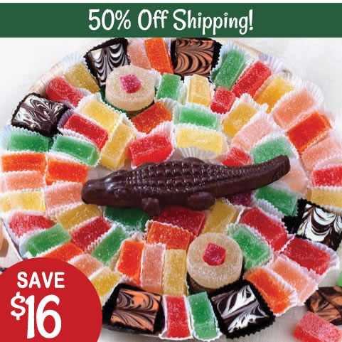 A big ole' solid chocolate Florida gator relaxes on his colorful candy island surrounded by our most popular assortment of homemade, soft and chewy citrus delicacy candies - orange, lemon, lime, and tangerine slices with sweet pineapple rings. Plus, creamy chocolate, orange, and vanilla fudge slices.